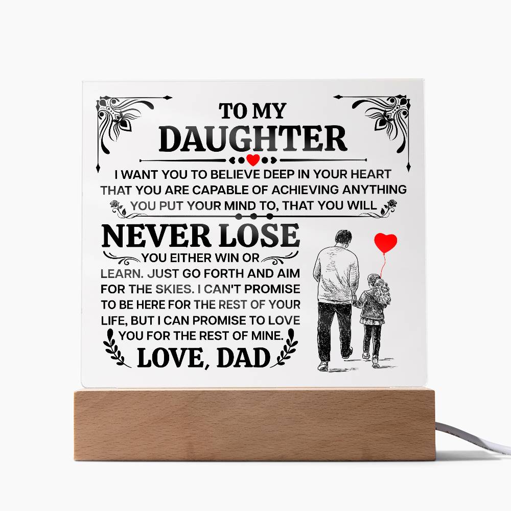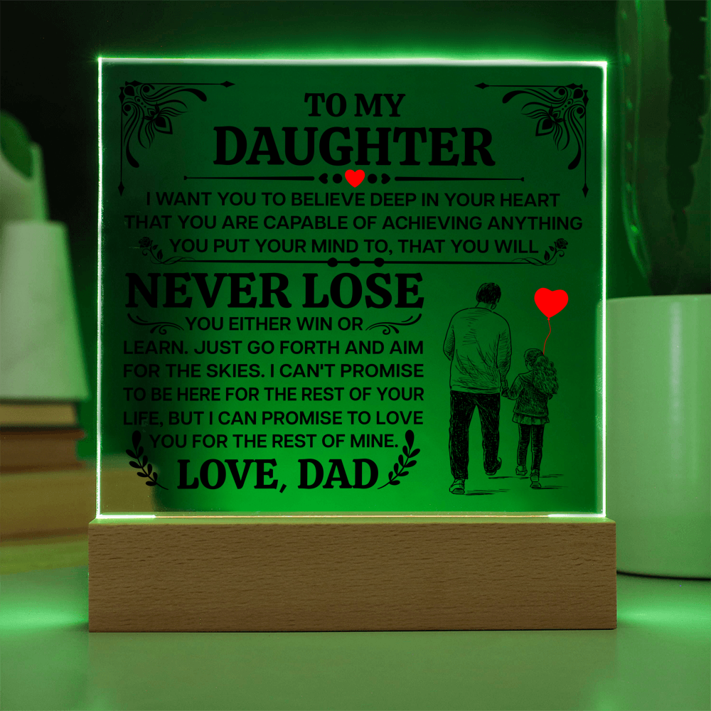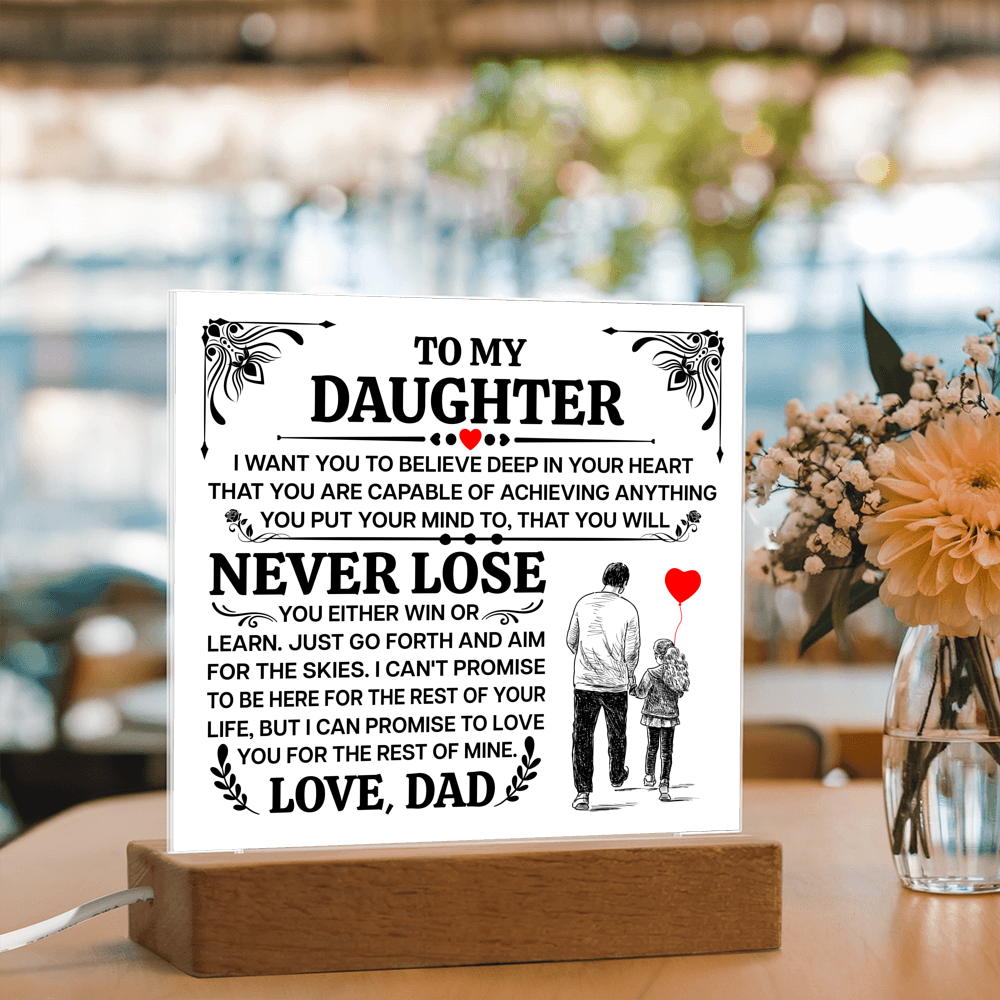 A promise that will last a lifetime. The To My Daughter, Promise LED Acrylic Square Plaque features a heartfelt message printed on crystal-clear premium acrylic, beautifully illuminated by a color-changing LED wooden base β a stunning display piece that reminds her every day how deeply she is loved.
